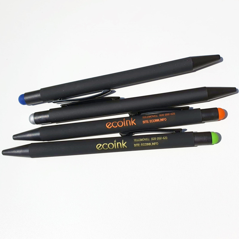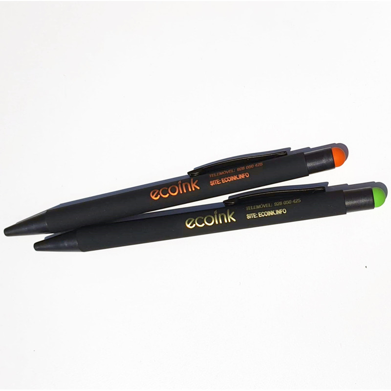 Caneta stylus com mecanismo de botão com corpo com acabamento em preto sólido. Clip metálico de cor preta.